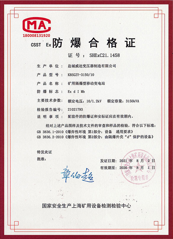 鹽城威達變壓器制造有限公司主要生產產品有KBSGZY系列礦用隔爆型移動變電站、KBSG系列礦用隔爆型干式變壓器、礦用一般型電力變壓器、干式變壓器、組合式變壓器、箱式變電站、低壓成套設備及特種變壓器。KBSG、KBSGZY系列礦用防爆變壓器廣泛用于有甲烷混合氣體和煤塵,且有爆炸危險的礦井中,作為礦井下泵站、運輸機、采掘機等用電設備的配電裝置。